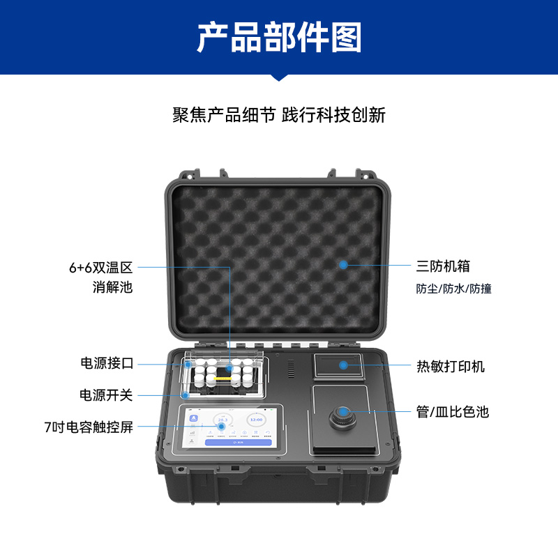 光源的持久耐用也是LH-C600的一大亮點。內置8個可見光波長LED光源,壽命長、更穩定且故障率更低,大幅降低了使用和維護成本。同時,戶外檢測便攜性也是該儀器的一大優勢。采用主機箱+配件箱的形式,耗材、配件完備,戶外檢測方便快捷。大容量鋰電池更是確保了儀器在戶外無電源條件下連續工作8小時以上的能力,讓水質檢測不再受地點和時間限制。