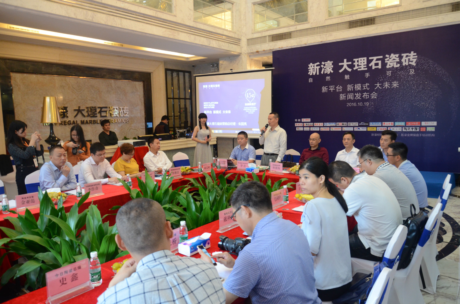 10月19日上午,新濠大理石瓷磚“新平臺 新模式 大未來”新聞發布會在佛山新濠展廳召開。華夏銀行佛山分行副行長劉振林、金融部總經理謝文斌,佛山陶瓷行業協會秘書長羅青,昊晟集團總經理杜湛權、財務總經理羅燕清,新濠大理石瓷磚品牌營銷總經理朱國亮、副總經理柯寓國,產品事業部策劃總監孫慶,以及來自行業的近30家主流媒體記者等出席發布會。